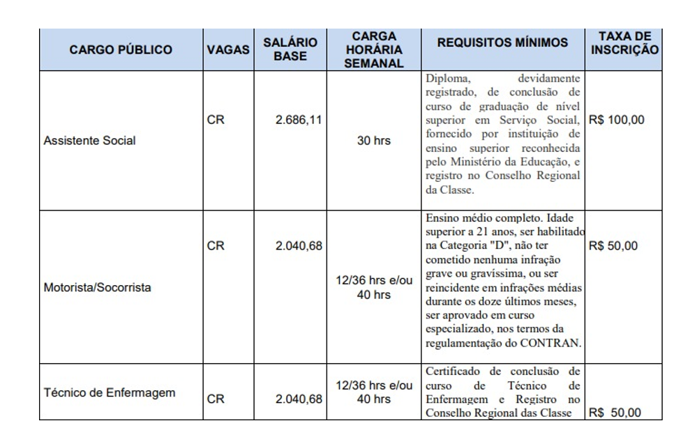 Quantidade de vagas, salário base, carga horária de trabalho, requisitos mínimos e a taxa de inscrição são os seguintes: