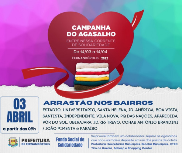 Em clima de união e amor ao próximo, a Prefeitura de Fernandópolis, por meio do Fundo Social de Solidariedade, com apoio da Secretaria da Assistência Social, promove no próximo domingo, dia 03 de abril, o segundo dia de arrastão da Campanha do Agasalho 2022.
