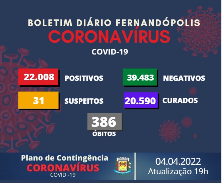 O Boletim Epidemiológico desta segunda-feira, 04, registra mais 21 casos positivos para Covid-19 em Fernandópolis. O número chega a 22.008 infectados desde o início da pandemia.
