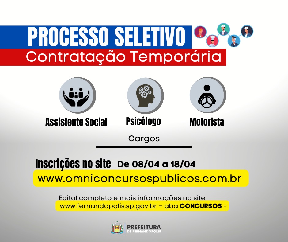 A Prefeitura de Fernandópolis abriu nesta sexta-feira, dia 8, o processo seletivo para contratação temporária de três cargos: Assistente Social, Psicóloga e Motorista.