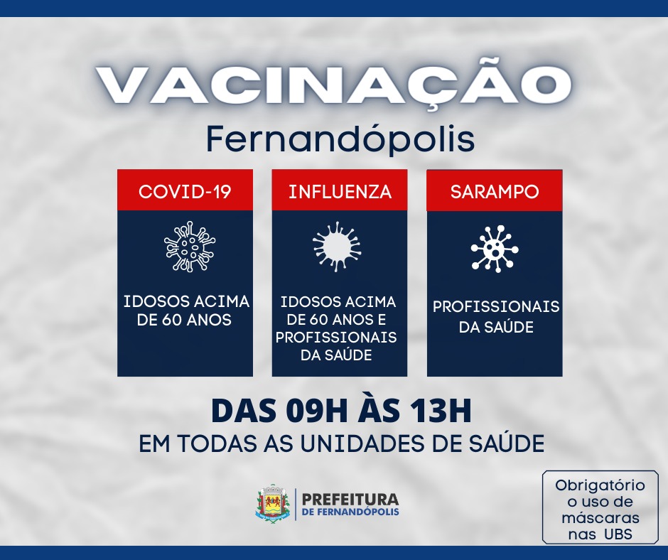 Nesse mesmo período, a Secretaria Municipal de Saúde de Fernandópolis realiza ainda a Campanha de Vacinação contra o Sarampo para os profissionais de Saúde, que segue até o dia 03 de junho.