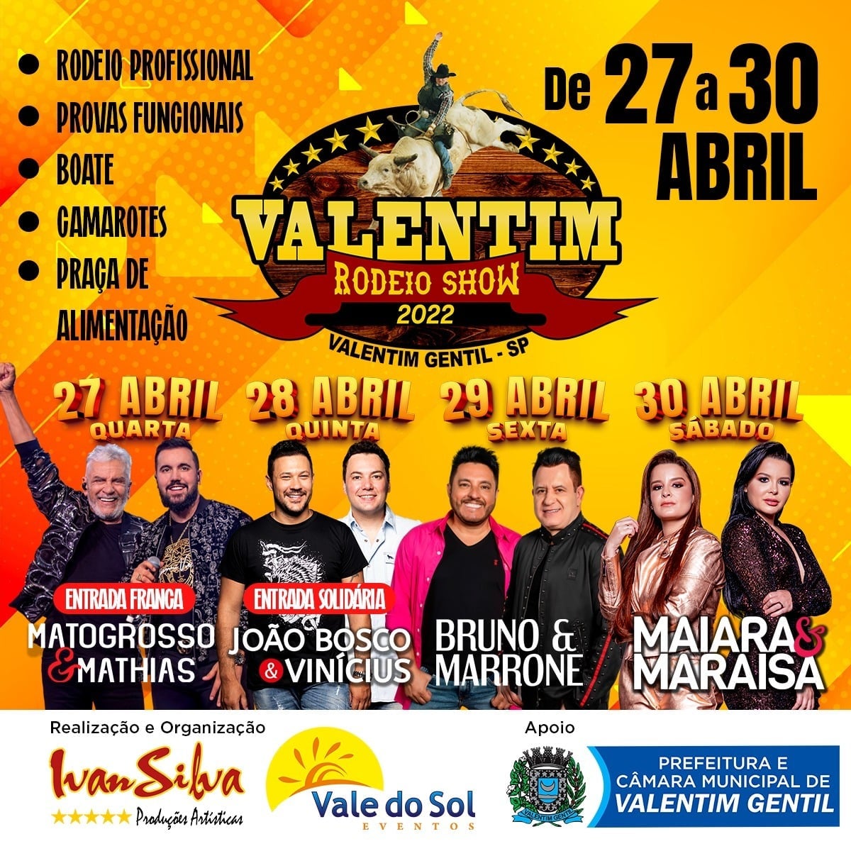 Nesta quarta-feira (27/04), abre as festividades a dupla Matogrosso e Mathias com entrada franca; na quinta-feira (28/04), com entrada solidária, tem show de João Bosco e Vinícius; pela primeira na história do município, a sexta-feira (29/04), terá o romantismo de Bruno e Marrone; e encerram a festa, no sábado (30/04), Maiara e Maraisa.