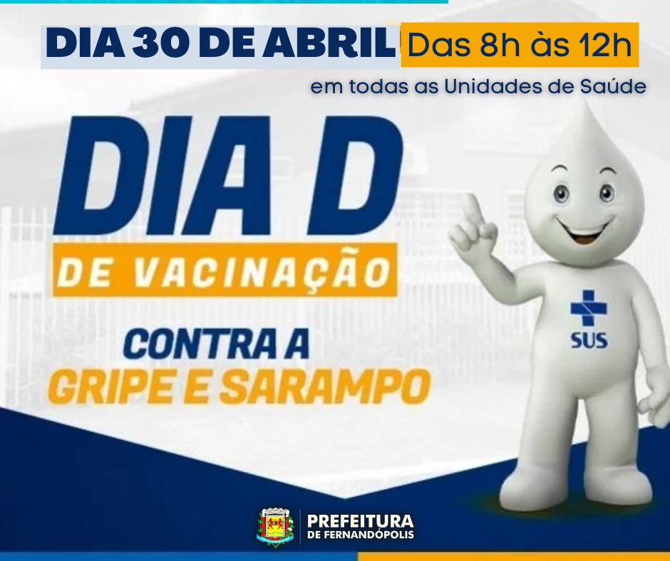 A Prefeitura de Fernandópolis, por meio da Secretaria Municipal da Saúde, realiza hoje, dia 30, o Dia D da Vacinação contra a Gripe e o Sarampo. Todas as unidades de saúde estarão abertas das 8h às 12h.
