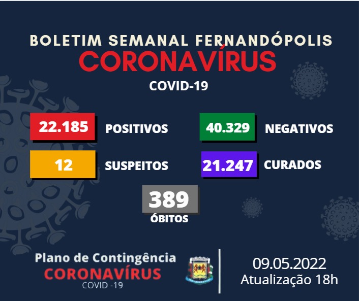 O Boletim Epidemiológico Semanal, divulgado nesta segunda-feira, 09, registra mais 35 casos positivos para Covid-19 em Fernandópolis. O número chega a 22.185 infectados desde o início da pandemia.