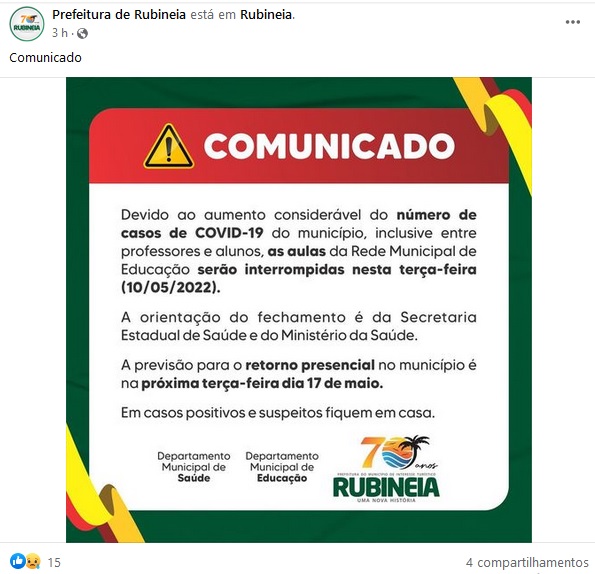 Reprodução do comunicado publicado no Facebook da prefeitura de Rubineia