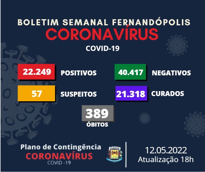 Mais um Boletim Epidemiológico foi divulgado nesta quinta-feira, 12. Foram registrados mais 64 casos positivos para Covid-19 em Fernandópolis em relação ao anterior, publicado na última segunda-feira, 09. O número chega a 22.249 infectados desde o início da pandemia.
