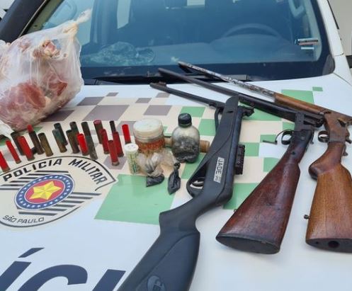 No último dia 10, durante realização da Operação Gaia, Policiais Militares do 4º Batalhão de Polícia Ambiental realizaram vistoria em uma propriedade rural no município de Riolândia, onde foram encontradas em duas edificações 02 espingardas e 01 carabina de pressão adaptada para receber cartuchos calibre .22, todas sem a documentação necessária, além de farta quantidade de cartuchos e aproximadamente 19 quilos de carne com o morador do local que confessou tratar-se de carne de capivara.