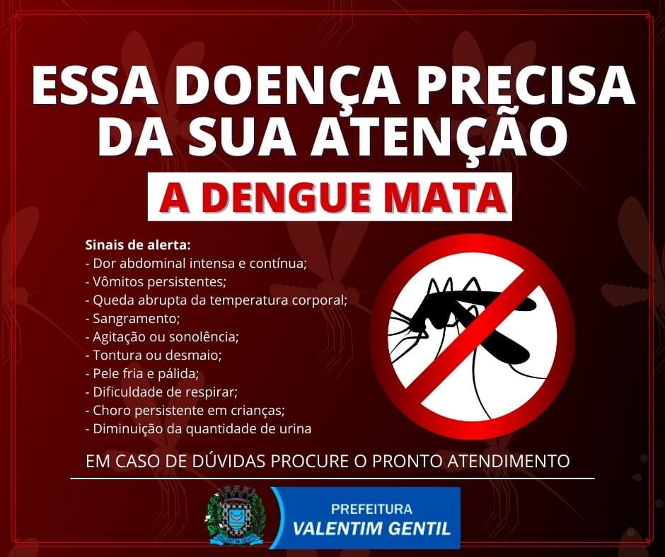 A Secretaria de Saúde alerta que os sintomas da dengue estão mais agressivos, devendo a população redobrar os cuidados. Entre os sinais de alerta estão: dor abdominal intensa e contínua; vômitos persistentes; queda abrupta da temperatura corporal; sangramento; agitação ou sonolência; tontura ou desmaio; pele fria e pálida; dificuldade de respirar; choro persistente em crianças; e diminuição da quantidade de urina.