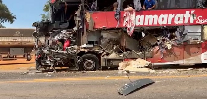 A causa da colisão ainda será esclarecida. O ônibus ficou às margens da rodovia.