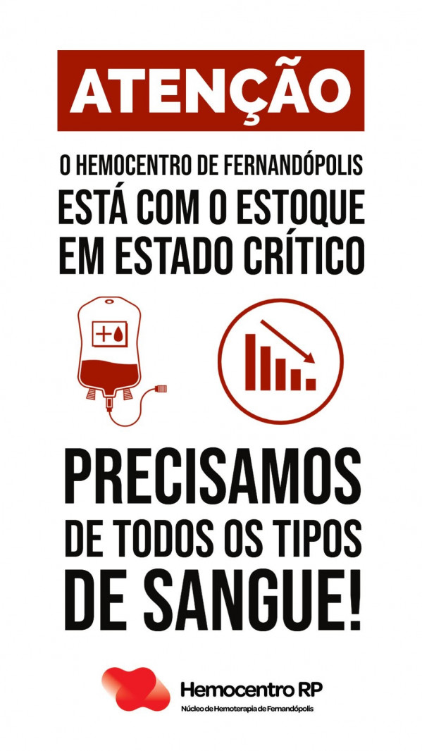 O Hemocentro de Fernandópolis está em estado de alerta, em função do baixo número de bolsas de sangue disponível. A quantidade de doadores tem sido pequena durante o mês de maio e o Centro necessita, com urgência, de todos os tipos sanguíneos.