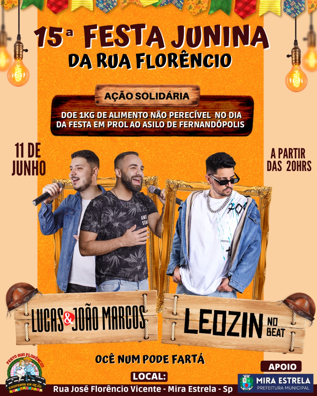 A animação do evento, que será realizado na Rua José Florêncio Vicente e tem o apoio da Prefeitura de Mira estrela, terá as presenças da dupla sertaneja Lucas & João Marcos e do DJ Leozin no Beat.