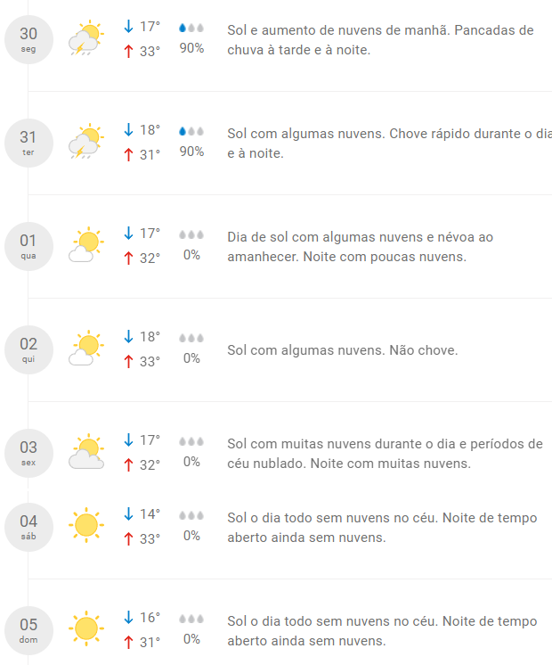 Já para o restante da semana não deve chover, e as temperaturas seguem variando entre 17ºC e 33ºC.