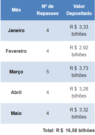 Os municípios já haviam recebido R$ 1,7 bilhão em repasses anteriores, realizados em 10, 17 e 24 de maio, relativo à arrecadação dos períodos de 2/5 a 6/5, 9/5 a 13/5 e 16/5 a 2/5, respectivamente. Com os depósitos efetuados hoje, o valor enviado às prefeituras em maio totaliza R$ 3,3 bilhões.