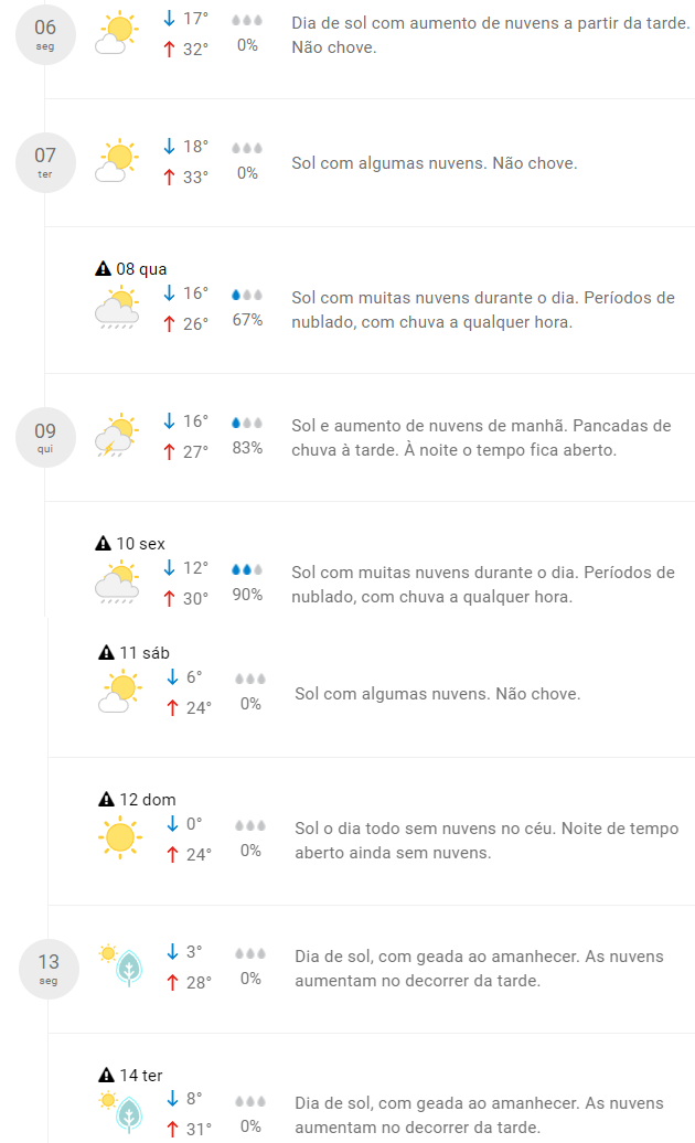 Em Fernandópolis, a temperatura mínima pode atingir 0°C no próximo domingo, 12 de junho, com chances de geada e temperaturas abaixo dos 10ºC na segunda, 13, e terça, 14. Além disso, antes da temperatura cair, entre quarta-feira, 08, e sábado, 11, pode chover.