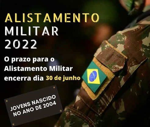 O prazo para o alistamento militar deste ano vai até o dia 30 de junho. Portanto, os jovens do município de Ouroeste que completam 18 anos em 2022 devem comparecer à Junta de Serviço Militar, localizada na Avenida dos Bandeirantes n° 2255, Jardim Sarinha, anexo ao Paço Municipal.