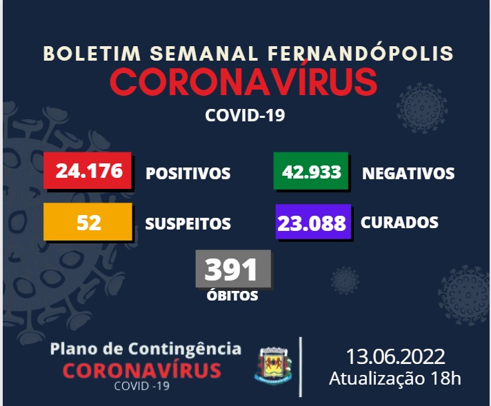 Mais um Boletim Epidemiológico foi divulgado nesta segunda-feira, 13. Foram registrados mais 605 casos positivos para Covid-19 em Fernandópolis em relação ao anterior, publicado na última segunda-feira, 06. O número chega a 24.176 infectados desde o início da pandemia.