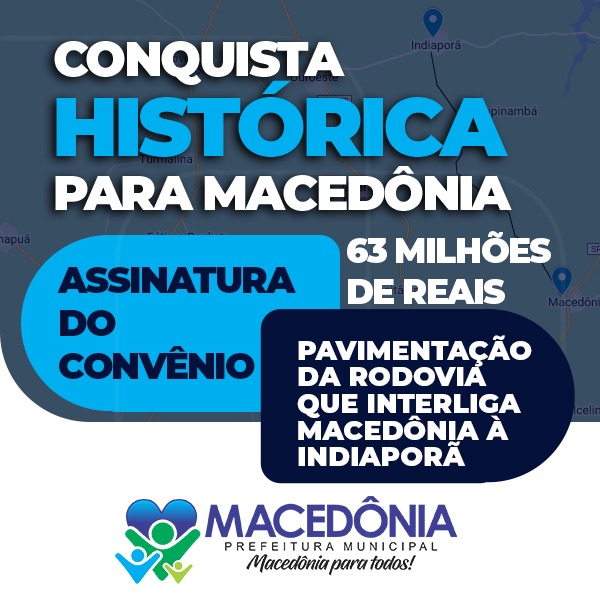 Na oportunidade foi assinado o convênio de mais de 62 milhões de reais para a pavimentação dos 24 km da rodovia que interliga o município de Macedônia à Indiaporã.