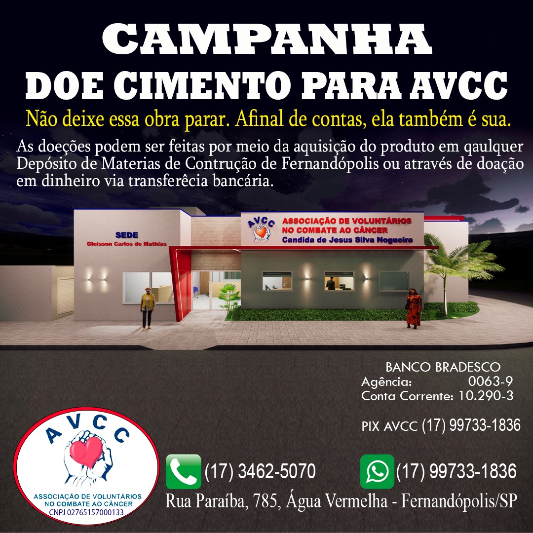 A Associação de Voluntários no Combate ao Câncer – AVCC – de Fernandópolis está realizando uma campanha para a arrecadação de cimento que será destinado à construção da sede da entidade.