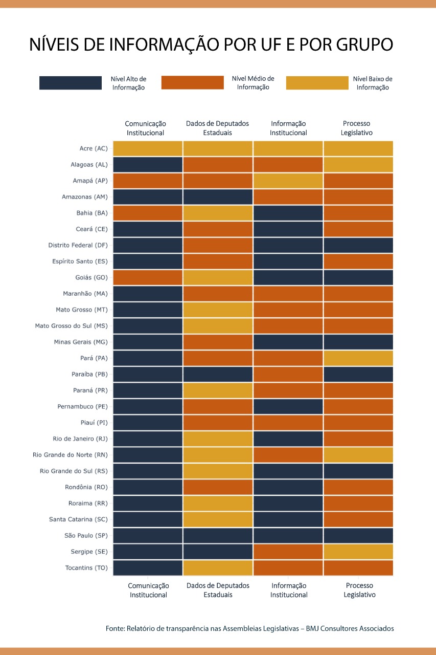 De acordo com o estudo, a Alesp é a única a alcançar nível alto em todos os quesitos. No item sobre dados dos parlamentares, por exemplo, apenas as Assembleias Legislativas dos Estados do Amazonas, Sergipe e Paraíba, além de São Paulo, têm alto nível de informação. Em outro ponto, de informações sobre o processo legislativo, apenas sete das 27 Casas no país têm alto nível.