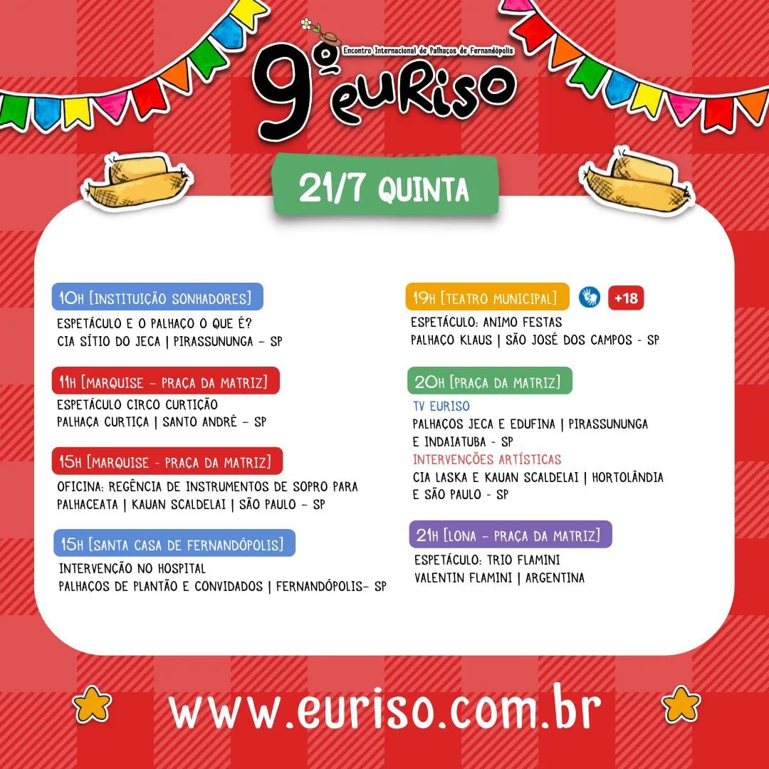 Considerado um dos maiores festivais de palhaços do Brasil e da América Latina, o 9º EuRiso acontece de 20 a 24 de julho, em Fernandópolis, com a participação de artistas nacionais e internacionais, num espaço de compartilhamento e recriação de manifestações artísticas, celebrando a riqueza e a importância da diversidade.