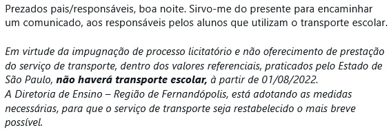 “Prezados pais/responsáveis, boa noite. Sirvo-me do presente para encaminhar um comunicado, aos responsáveis pelos alunos que utilizam o transporte escolar. Em virtude da impugnação de processo licitatório e não oferecimento de prestação do serviço de transporte, dentro dos valores referenciais, praticados pelo Estado de São Paulo, não haverá transporte escolar, à partir de 01/08/2022. A Diretoria de Ensino – Região de Fernandópolis, está adotando as medidas necessárias, para que o serviço de transporte seja restabelecido o mais breve possível”.