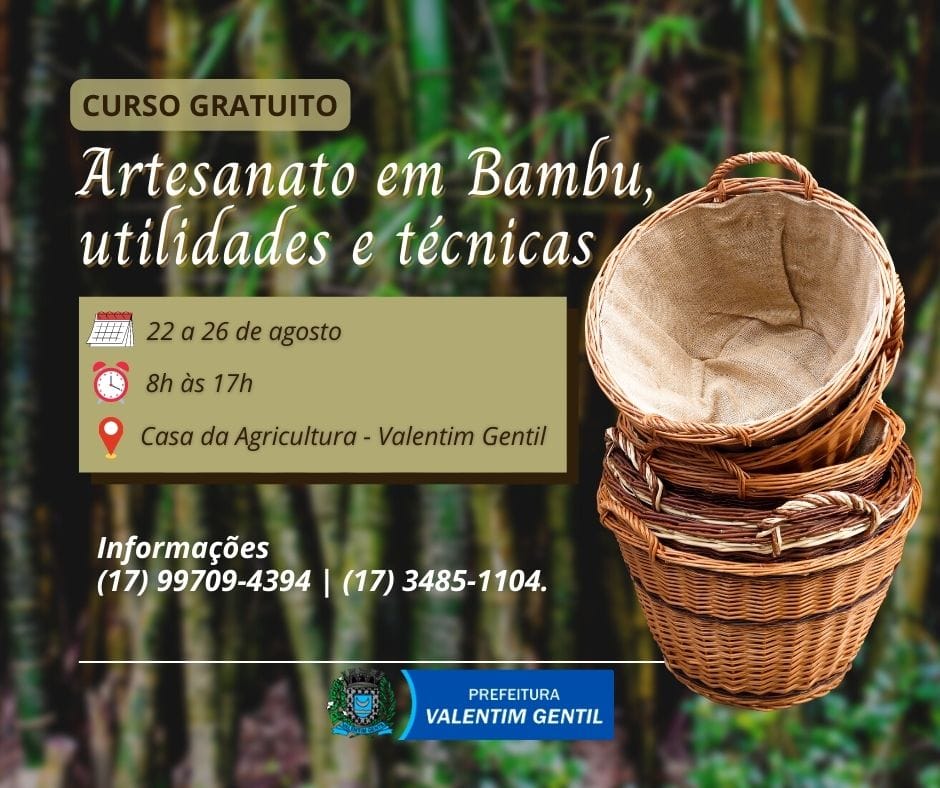 A Casa da Agricultura de Valentim Gentil oferecerá o curso gratuito de artesanato em bambu, utilitários e técnicas. A capacitação é promovida pelo SENAR – Serviço Nacional de Aprendizagem Rural.
