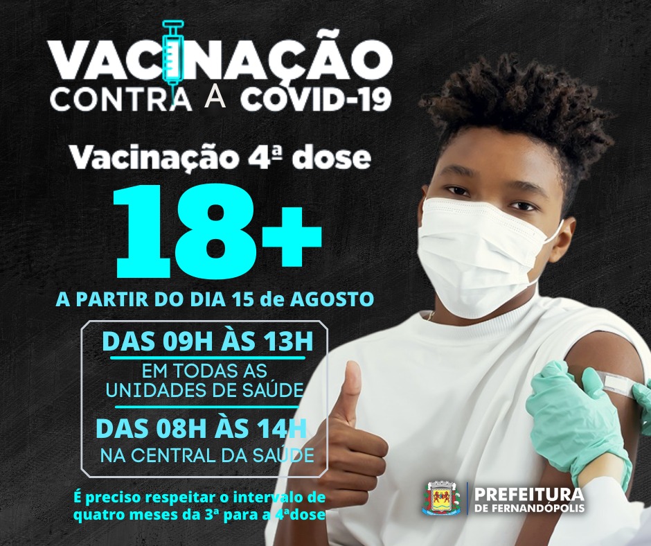 A partir da próxima segunda,15, estará liberada em Fernandópolis a quarta dose da vacina contra a Covid-19 para pessoas com 18 anos ou mais. Todas as Unidades de Saúde aplicarão o imunizante das 09h às 13h, já na Central da Saúde o atendimento será das 08h às 14h.