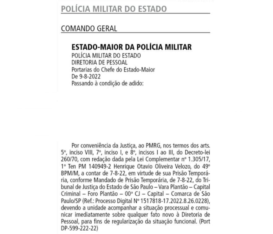 O Governo de São Paulo suspendeu o pagamento de salário para o policial militar Henrique Otávio Oliveira Velozo, que é acusado de matar o lutador de jiu jitsu Leandro Lo. A portaria do Comando Geral da PM que determina a suspensão foi publicada na edição de quarta-feira (10) do Diário Oficial do Estado. A medida foi adotada por causa da decretação da prisão preventiva do acusado, no dia 7 de agosto. A suspensão é retroativa e é válida desde a data da decisão judicial.
