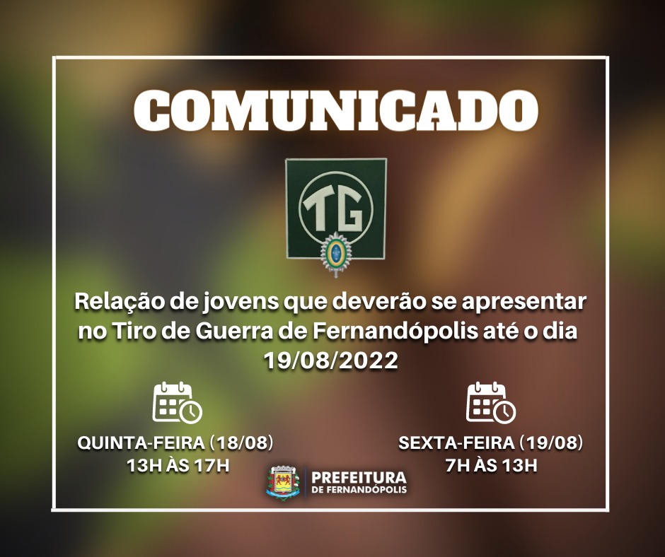 O Tiro de Guerra (02-083) de Fernandópolis está convocando com extrema urgência, os jovens que ainda não compareceram na unidade para se apresentarem. O prazo é até está sexta-feira, 19, às 13h, e todos devem estar munidos com seus documentos pessoais.