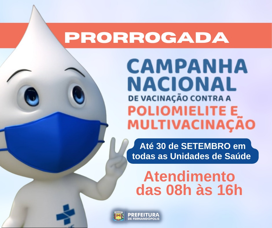 Em andamento desde o início de agosto, a Campanha Nacional de Vacinação contra a Poliomielite e de Multivacinação foi prorrogada em todo país até o dia 30 de setembro. A ampliação do prazo tem o objetivo de aumentar as coberturas vacinais e a adesão da população a vacinação. Em Fernandópolis, todas as unidades de saúde participam da mobilização das 08h às 16h, de segunda a sexta-feira.