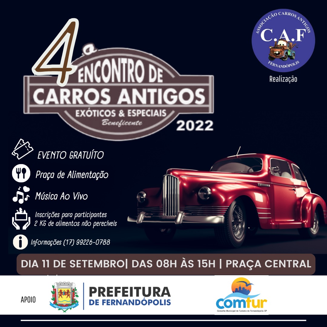 Fernandópolis promove no próximo domingo, 11, a 4ª edição do ‘Encontro de Carros Antigos’, na Praça Central. O evento é realizado pela C.A.F. – Carros Antigos Fernandópolis e tem o apoio da Prefeitura e COMTUR. Vários expositores da região participam do encontro que terá música ao vivo e praça de alimentação.