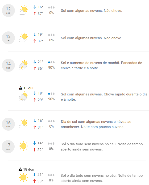Nos demais dias, inclusive no final de semana, não deve chover. As temperaturas podem variar entre mínimas de 14ºC no próximo sábado, e 38ºC no domingo.