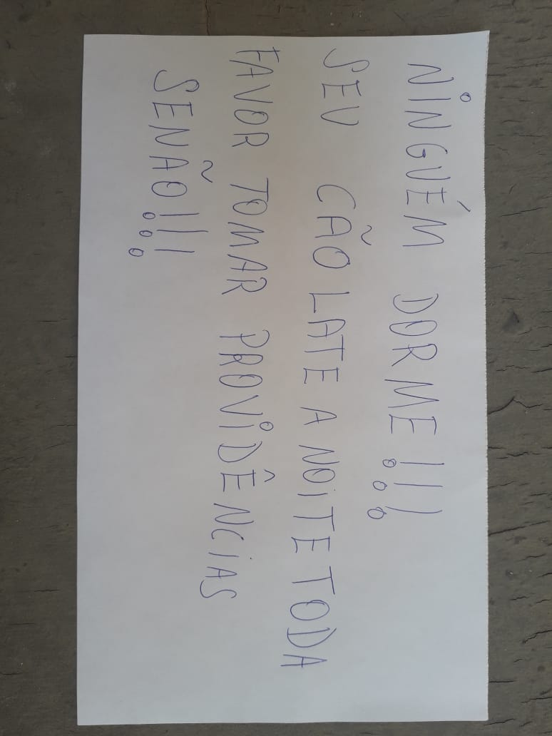 De acordo com o autônomo Rogério Novais, 42 anos, no bilhete, que foi deixado na caixa do correio, o vizinho escreveu: “ninguém dorme!!!Seu cão late a noite toda. Favor tomar providências. Senão!!!”, ameaçou.