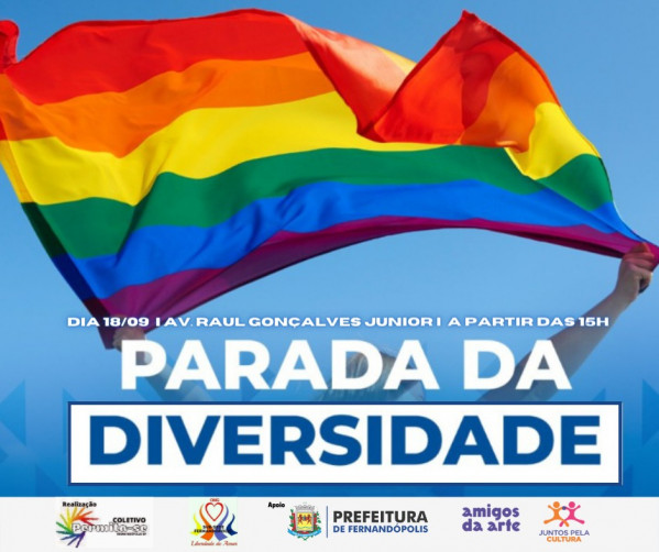 Com muita cor, animação e música, a 1ª Parada da Diversidade acontece neste domingo, 18, em Fernandópolis. O evento terá início às 15h com concentração na cobertura do Mercadão Municipal na (Travessa Antônio Barbieri), seguindo até a Avenida Raul Gonçalves Júnior, esquina com a Rua Recife, onde acontecerão os shows.
