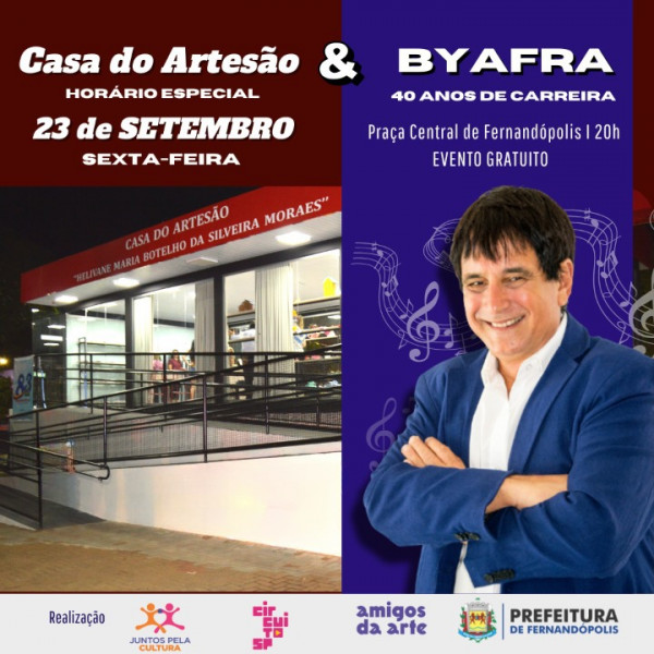A Secretaria Municipal de Cultura e Turismo confirmou que a Casa do Artesão estará funcionando em horário especial na sexta-feira, 23, quando haverá apresentação no palco de eventos da Praça Central do cantor Byafra. O show está previsto para começar a partir das 20h e a exposição e comercialização dos produtos estará disponível ao público até o término da apresentação.