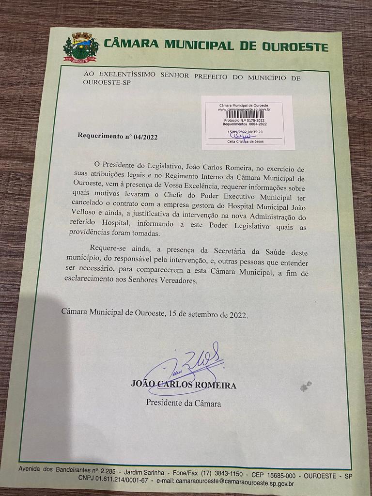 João Carlos Romeira, presidente da Câmara Municipal de Ouroeste, município localizado a 37 quilômetros de Fernandópolis, por meio de requerimento, protocolado na quinta-feira, dia 15, requer informações sobre quais motivos levaram o prefeito Alex Sakata ter cancelado o contrato com a empresa gestora do Hospital Municipal João Velloso.