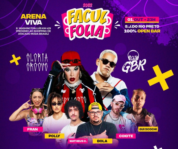 No próximo dia 1º de outubro, Rio Preto vai cair na folia universitária com o Facul Folia. Sucesso de vendas desde o final de agosto, o evento terá como atrações DJ GBR e Glória Groove, pela primeira vez na cidade. Também integram o line-up Matheus Caparroz, DJ Fran, Polly, DJ Coiote, DJ Bola e Gui Scochi.