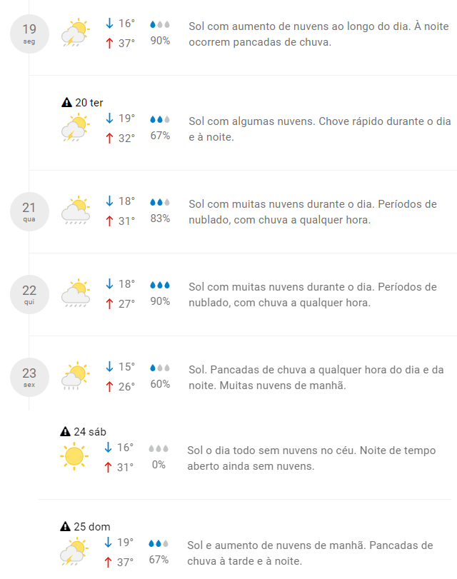 Ainda de acordo com a previsão, o único dia que não deve chover é no sábado, 24, quando a previsão prevê sol durante todo o dia. No domingo, as nuvens voltam a se formar, com possibilidade de chuva à tarde e à noite.