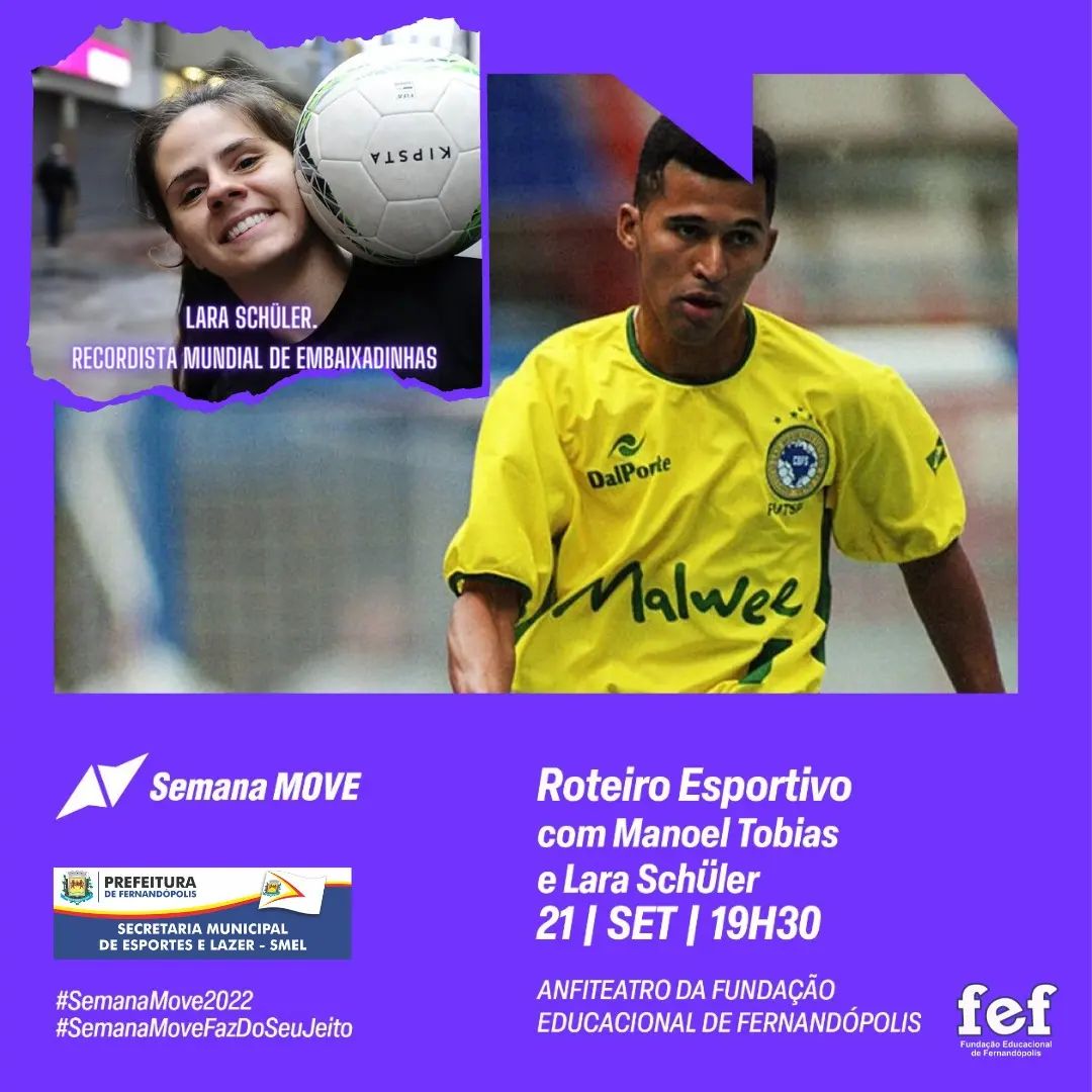 Além de Manoel Tobias, o programa traz para Fernandópolis na mesma data a atleta Lara Schüler, recordista brasileira de embaixadinhas. “Esse projeto é muito interessante, pois com ele temos a possibilidade de ouvir os ex-atletas de ponta do esporte nacional. O compartilhamento de suas experiências com os jovens é muito importante”, disse o secretário municipal de Esportes, Humberto Cáfaro.