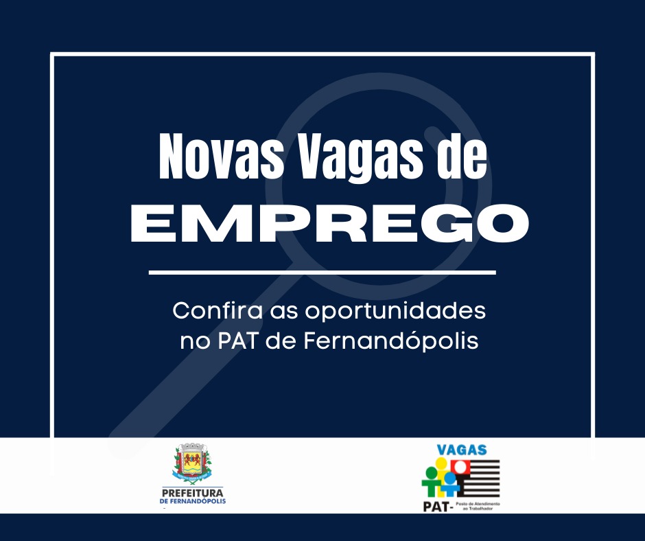 O PAT (Posto de Atendimento ao Trabalhador) de Fernandópolis oferece novas vagas de emprego em seu painel de ofertas. Os interessados devem preparar seus currículos de acordo com as exigências do empregador.