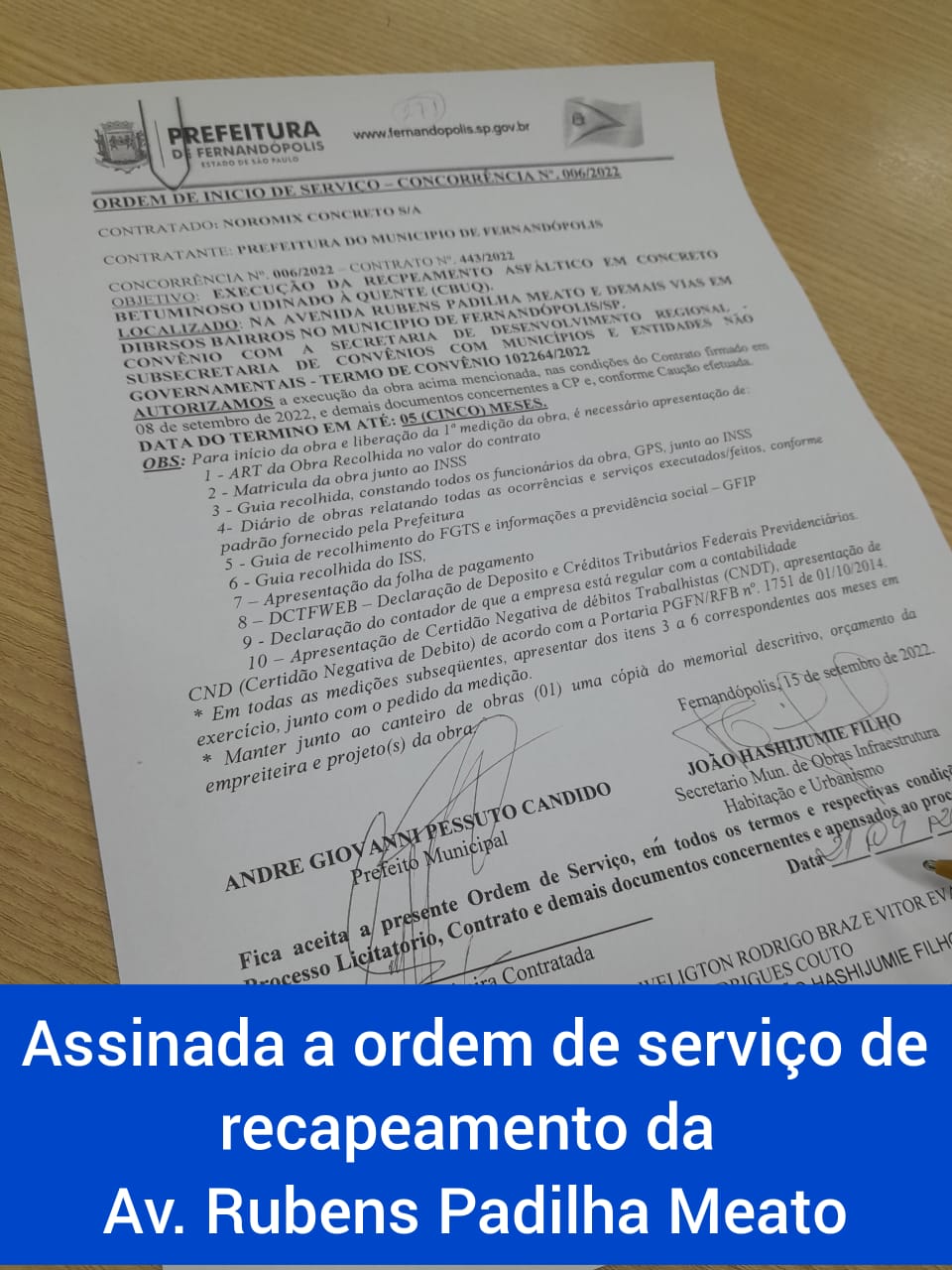 O prefeito André Pessuto assinou a ordem de serviço para o início dos serviços de recapeamento asfáltico de toda a extensão da avenida Rubens Padilha Meato de Fernandópolis. A via possui um grande fluxo de veículos interligando os bairros Jd. Paraíso, Cohab’s Antônio Brandini e João Pimenta, Alto das Paineiras, Santa Cecília e Botelho.