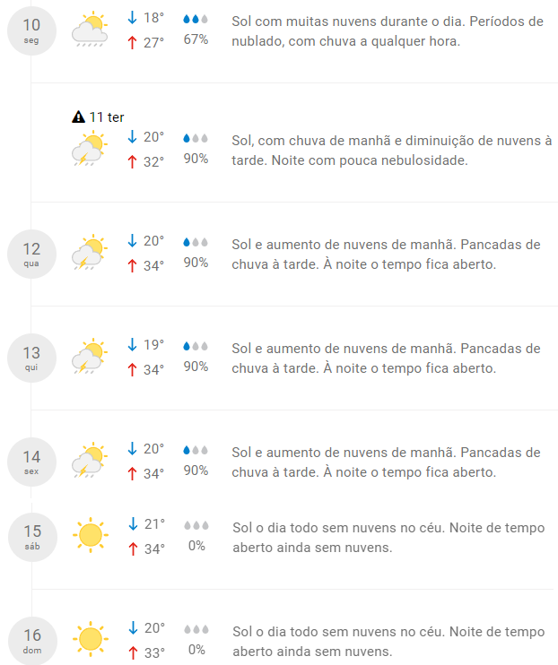Segundo o portal, já nesta segunda-feira, 10, o dia deve ser sol com muitas nuvens e chuva a qualquer hora.