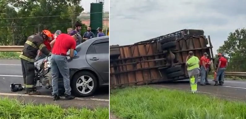 O carro teria esbarrado na lateral do caminhão após tentar realizar uma ultrapassagem. Com o impacto, o caminhão acabou tombando sobre a pista. Os envolvidos no acidente sofreram apenas ferimentos leves.