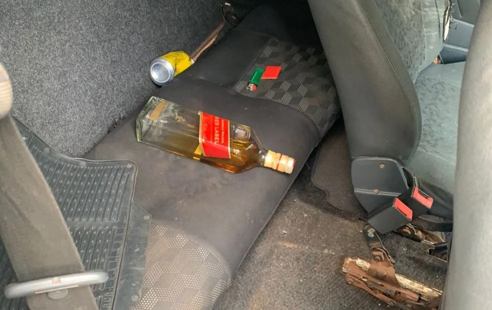 Também foram encontrados uma garrafa de whisky, restos de papel higiênico usados, uma lata de alumínio e isqueiro, provavelmente usados para o consumo de crack dentro do veículo.