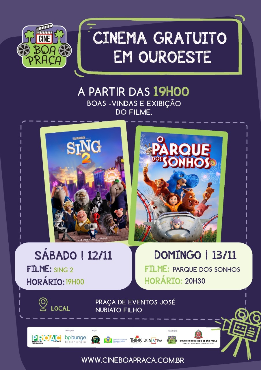 Ouroeste: Dia 12, às 19h, filme “Sing 2”; Dia 13, às 20h30, filme “Parque dos Sonhos”