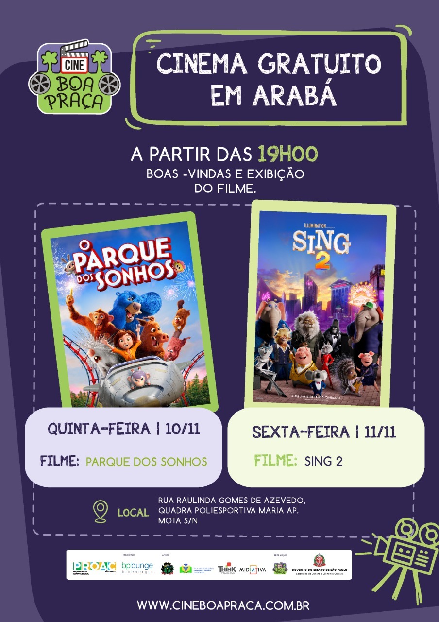 Arabá – distrito de Ouroeste: Dia 10, às 19h, filme “Parque dos Sonhos”; Dia 11, às 19h, filme “Sing 2”