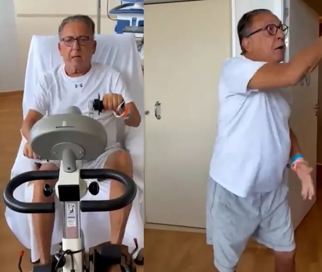 O apresentador, que tem 72 anos, publicou uma foto no Instagram fazendo exercícios no hospital e afirmou que está "... fazendo exercício duas vezes por dia. Musculação, bicicleta, para chegar inteiraço na Copa".