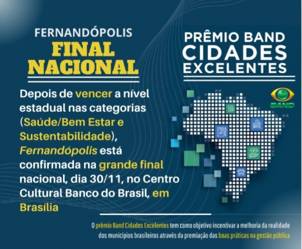 Depois de vencer o prêmio ‘Band Cidades Excelentes’ a nível estadual nas categorias (Saúde/Bem Estar e Sustentabilidade), a cidade de Fernandópolis está confirmada na grande final nacional da premiação, que acontece no dia 30 de novembro, no Centro Cultural Banco do Brasil, em Brasília. O local do evento é o mesmo que utilizado atualmente para a transição administrativa do Governo Federal.