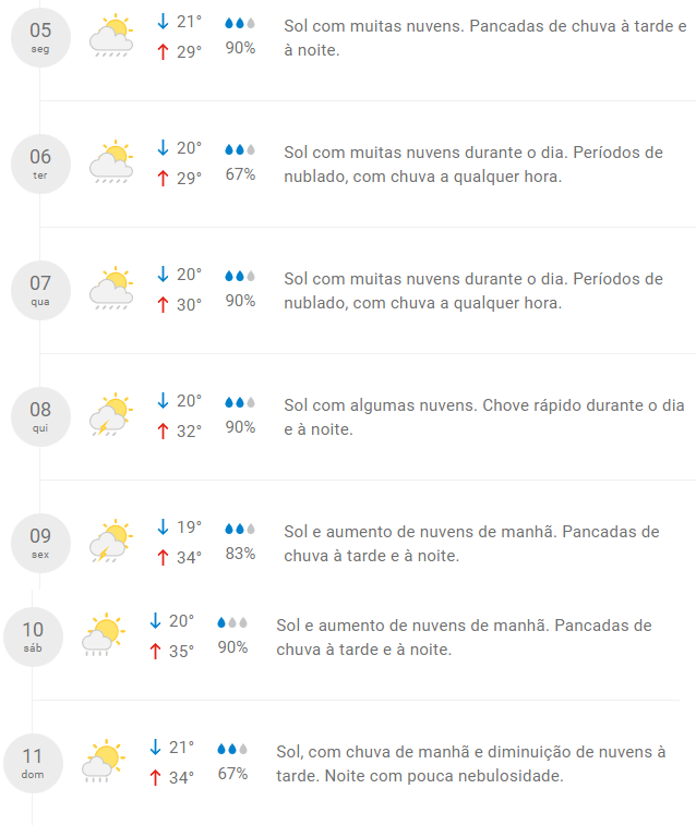 A possibilidade de chuva pode variar entre 67 e 90% dependendo do dia