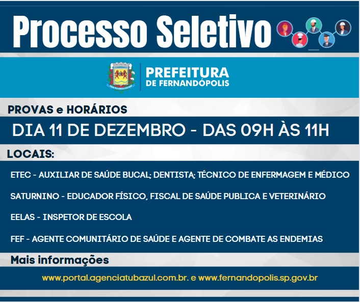 A Prefeitura de Fernandópolis realiza um Processo Seletivo para contratação de profissionais em diferentes funções, sendo: Auxiliar de Saúde Bucal, Fiscal de Saúde Pública, Inspetor de Escola, Técnico de Enfermagem, Dentista ESF, Educador Físico, Médico ESF, Médico Veterinário, Agente Comunitário de Saúde e Agente de Combate às Endemias. No total são 110 contratações e cadastro reserva.